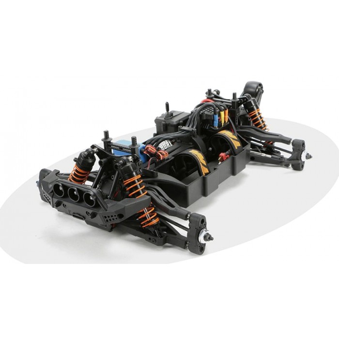 Безколекторний електродвигун вже в стоці має розмір 3655 і не вимагає ніякого тюнінгу і поліпшень. Це найпотужніший двигун для моделей цього масштабу! Обороти двигуна в 1.5 рази вище середнього і складають 4400KV, що і забезпечує рекордно високу швидкість моделі і висоту стрибків. Для надійної роботи з такою високою потужністю інженерами було вирішено використовувати сталеві шестерні з модулем 1.0 і вал двигуна 5мм, подібно моделям в масштабі 1:8. Хекса також збільшені до 14мм і надійно справляються навіть з піковим навантаженням, передаючи крутний момент колесам на максимальній тязі. Покришки K-Factory виготовлені з м'якого складу з гарним зчепленням і забезпечують високу продуктивність і швидкий розгін.