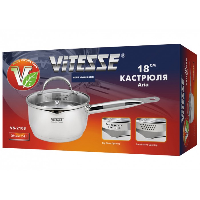 Посуд виробництва французької компанії Vitesse відрізняється якістю та оригінальністю дизайну. Швидке нагрівання та рівномірний розподіл тепла по всій поверхні. Капсульоване дно із прошарком із алюмінію забезпечує рівномірний розподіл тепла. Кришки з термостійкого скла дозволяють стежити за процесом приготування. Елегантні ручки з нержавіючої сталі, що надійно кріпляться до корпусу.
