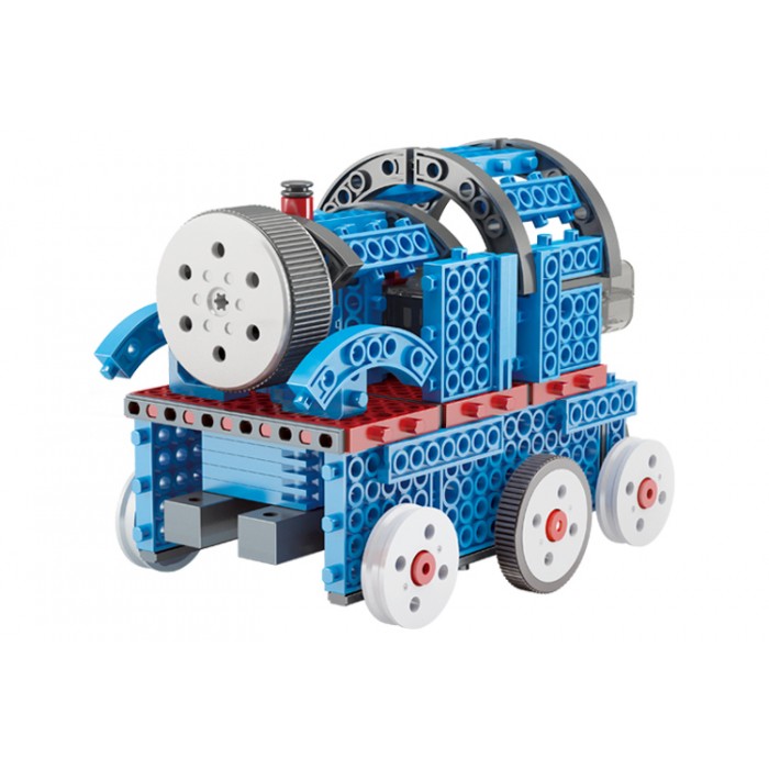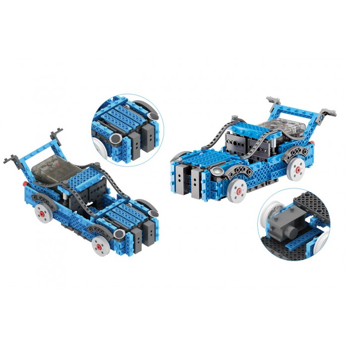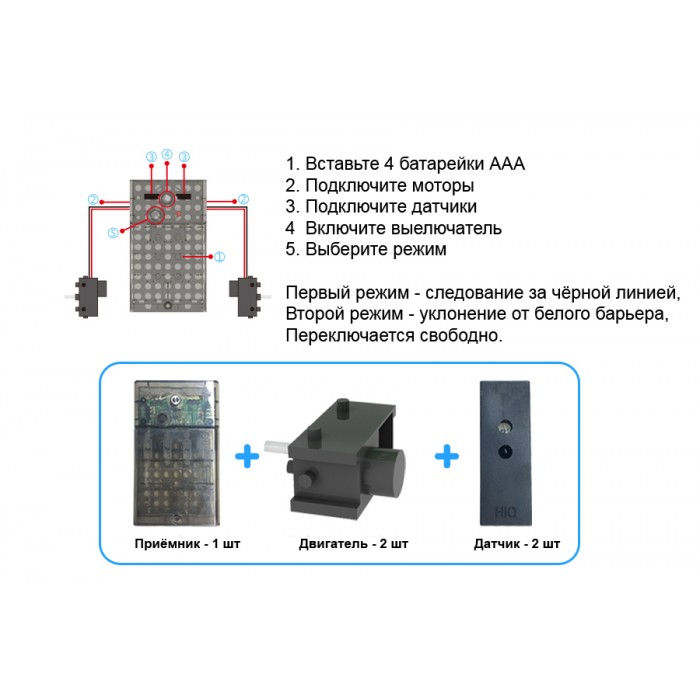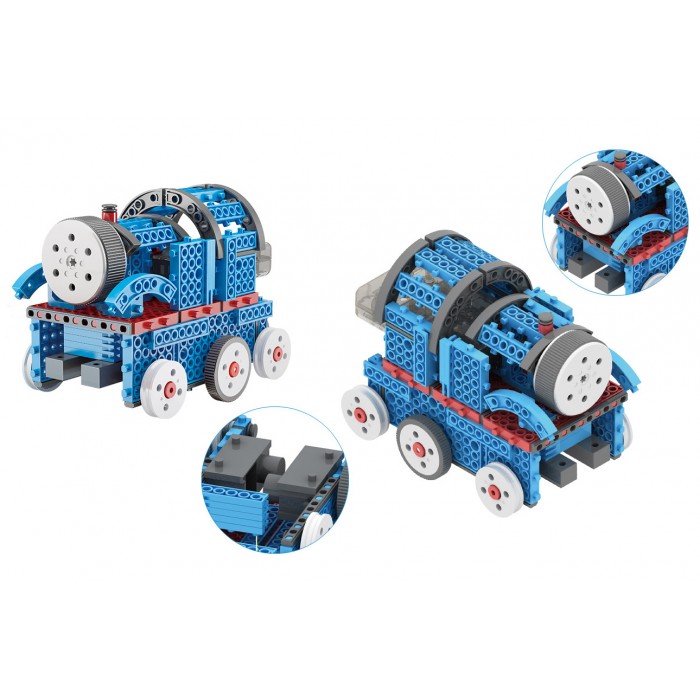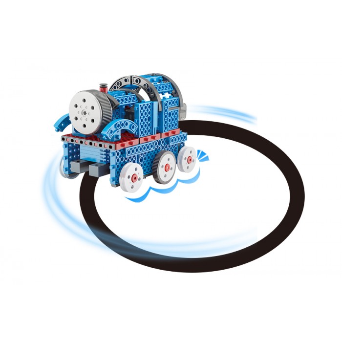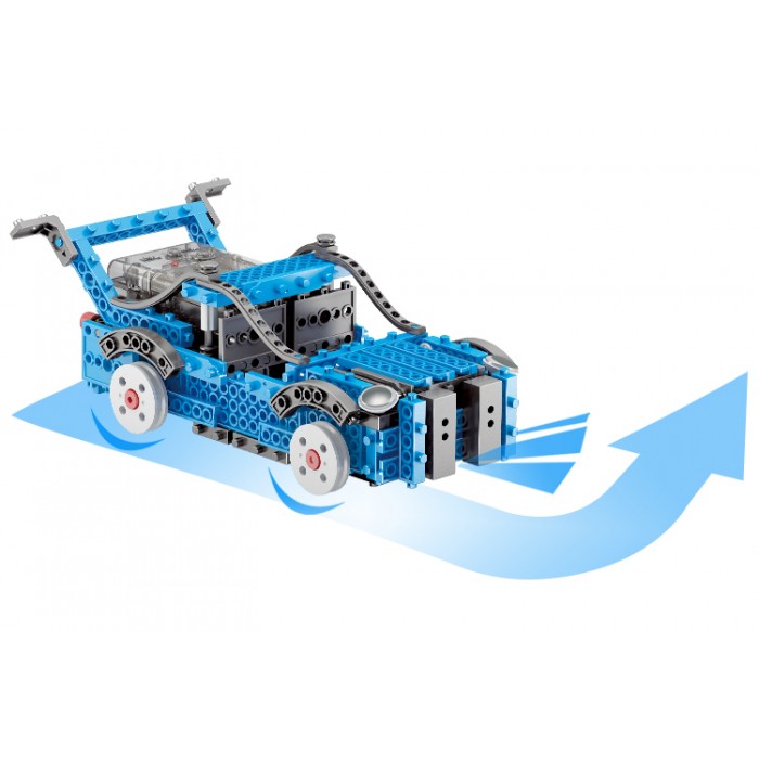 У комплекті яскраві барвисті деталі з на 100% безпечного матеріалу, двигуни, контролер і датчики. Дитині допоможе детальна кольорова інструкція в картинках. Після складання потрібно вибрати режим роботи датчиків: на проходження по лінії або режим обходу перешкод.