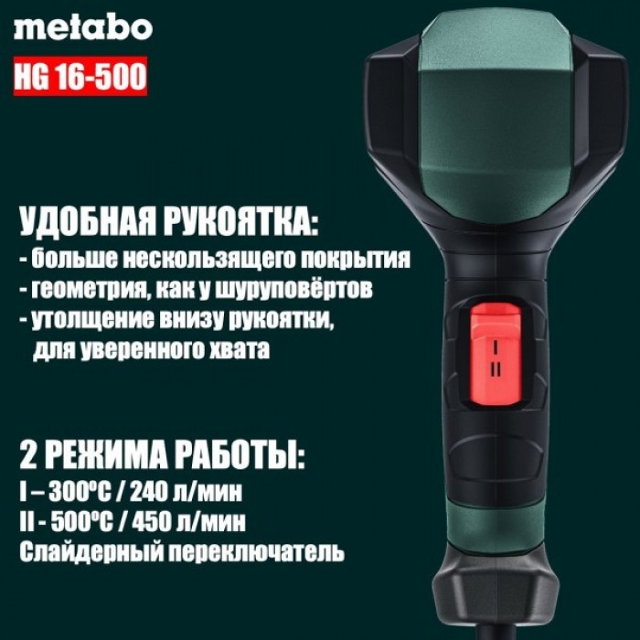Термофен Metabo HG 16-500 потужністю 1600 Вт має найширший спектр застосування — це і зняття лакофарбового покриття, надання форми виробам, розм'якшення клею, зварювання, стискання тощо.